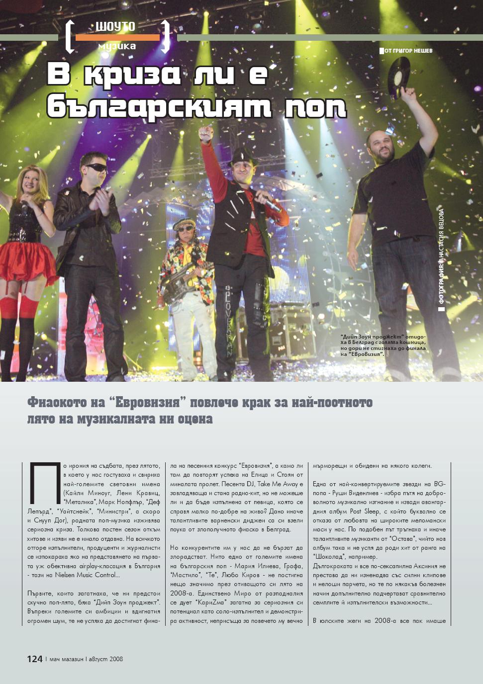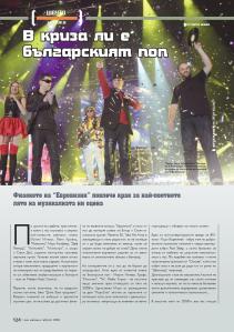 >В криза ли е българският поп > Фиаското на „Евровизия“ повлече крак за най-постното лято на музикалната ни сцена. Статия от секцията „Шоуто“ на списание „Мач магазин“ Сподели това:Сподели Click to share on X(Отваря се в нов прозорец) X Споделяне във Facebook(Отваря се в нов прозорец) Facebook Натиснете, за да споделите в Tumblr(Отваря се в нов прозорец) Tumblr Натиснете, за да споделите в Pocket(Отваря се в нов прозорец) Pocket Харесвам Зареждане... Вашият коментар Отказ Δ