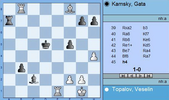 Веселин Топалов се класира преждевременно на финала за световната титла по шахмат срещу Ананд, след като победи Гата Камски и в 7-ата партия от мача на претендентите. Така с общ резултат 4.5: 2.5 русенецът се оказа недостижим от руснака с американски паспорт. На диаграмата виждате финалната позиция от партията, при която Камски се предаде:
