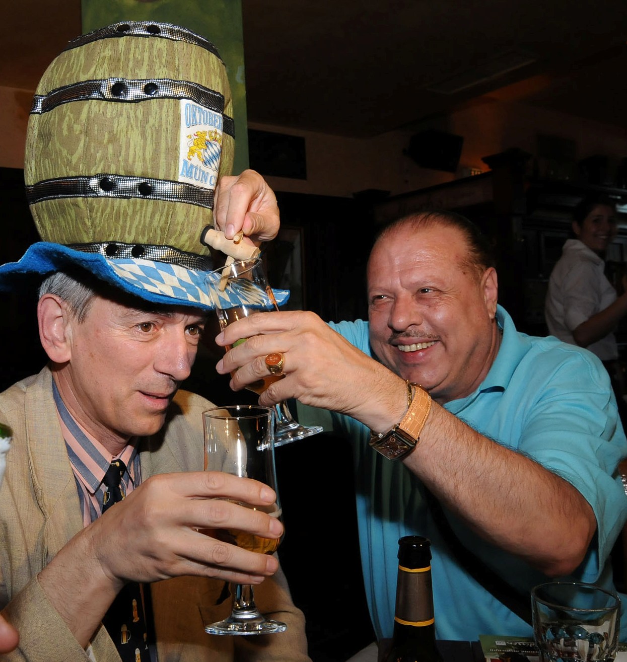 Агент Тенев си налива бира от шапката на председателя на Бирената партия Георги Гълов по време на Първия бирен салон, състоял се в ирландския пъб Flannagans вчера.