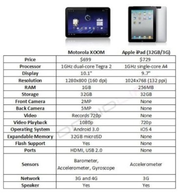 >Сравнение между дългоочаквания таблет на Motorola (с Android 3.0 Honeycomb), който излиза на 17 февруари и първообраза на всички таблети от Apple. Въпросът не е кой е по-добър в момента – отговорът е ясен, а колко време Xoom ще издържи конкуренцията на следващото поколение iPad, което се очаква също тази година